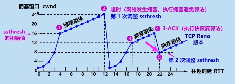 当达到了这个阈值之后,会进行拥塞避免阶段,让拥塞窗口 cwnd 缓慢地增大,避免出现拥塞当拥(不再按照指数⽅式增⻓, ⽽是按照线性⽅式增⻓)