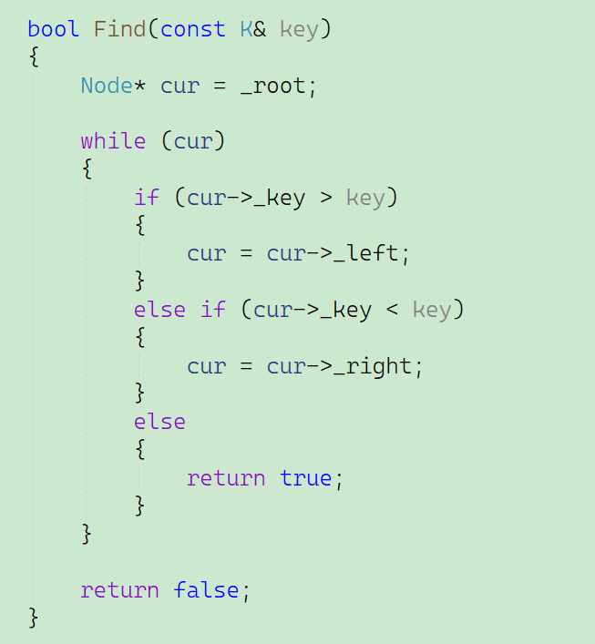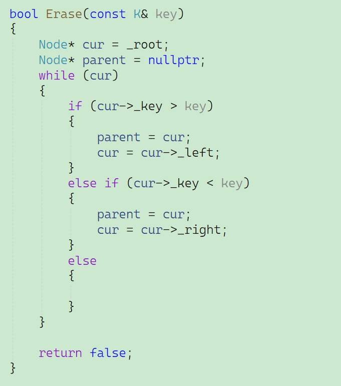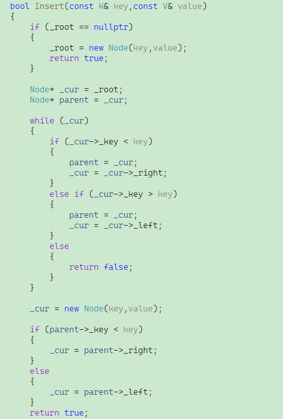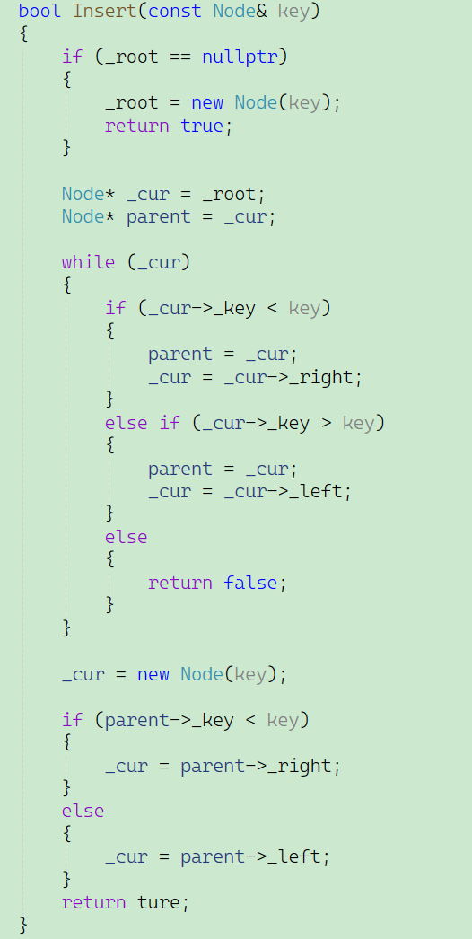 在这段代码当中,主要讨论树不为空的情况,先建立一个变量_cur记录下根节点,再建立一个变量parent用来记录_cur的父节点。我们通过比较插入值和_cur所指向的节点的值进行比较,如果插入值大于_cur所指向的值,就让_cur的位置不断地向其子节点移动,while循环中有一个return false的语句,代表不允许插入相同值。