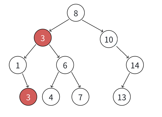 如果支持插入相等的值,意味着有多个 x 存在,一般要求查找中序的第一个 x。如下图,查找 3,要找到 1 的右孩子的那个 3 返回。