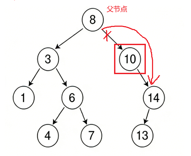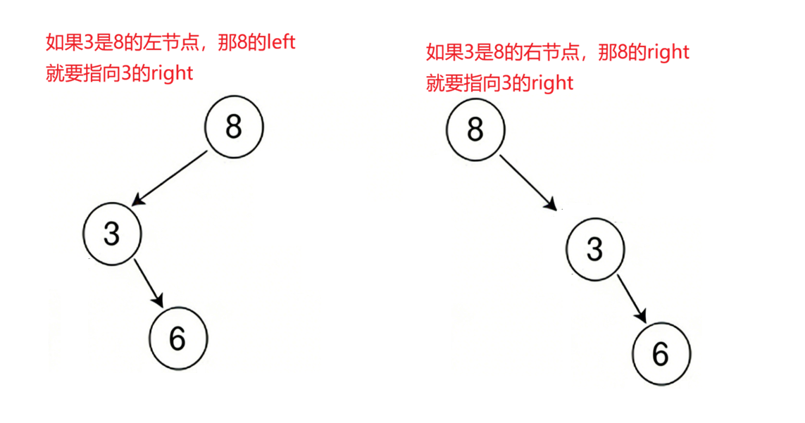 :**我们上面的查找代码中的parent = cur,它只是记录下来parent是哪个节点,cur是哪个节点,但并没有指出cur是parent的左子节点还是右子节点。**所以在这里需要进行判断,上面的代码的逻辑就如下图所示: