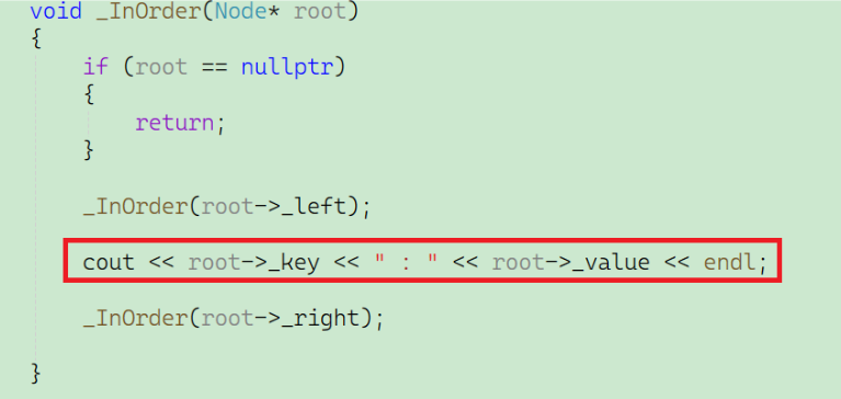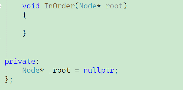先搭建一个大致的框架,大概是这样。但是我们其实会面临一个问题:因为这个函数是写在类模板里面的,那么比如说:当我实例化出一个对象 T 之后,想要调用这个函数,那使用方法就是T.InOrder( T->_root),但是我们发现,类当中的_root是被私有限定住的,无法在外部调用。但是被private限定符限定的成员变量,在类内部可以使用,于是我们采用这个方法: