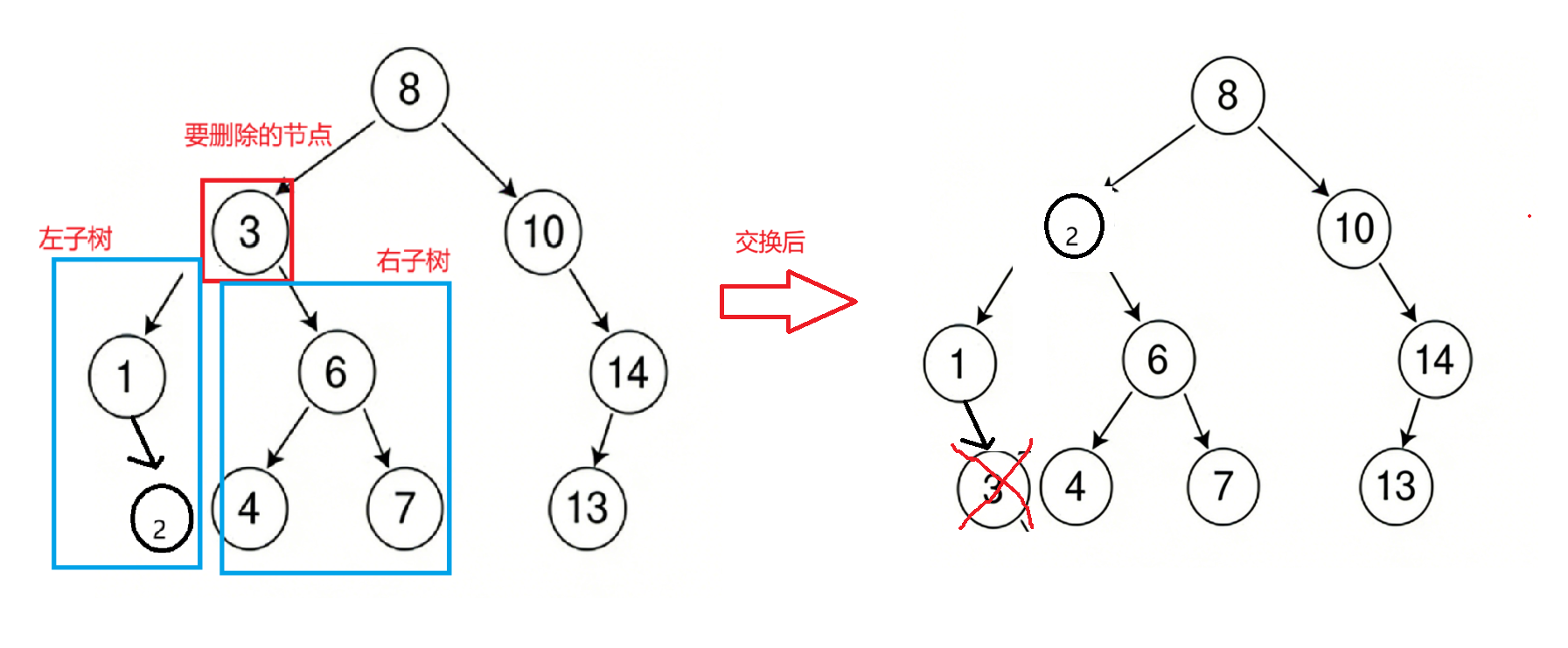 我们先定义了一个变量Rightmin记录下cur的右子树的最小值,找到之后让cur节点的值等于其右子树中最小的值。下面还有一个注意的点,用图片来解释:
