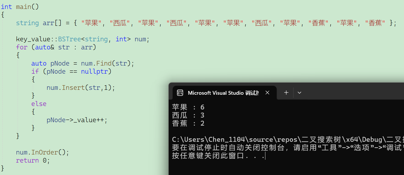 在这段代码当中我们给出了一系列水果的名称,然后希望能统计出出现水果名称的次数。首先实例化出了一个对象num用于存储节点,接着遍历整个数组,先判断这个水果名称是否在二叉搜索树当中,如果在,那就直接让这个水果的出现的次数+1,也就是pNode->_value++;如果不在,那pNode就是nullptr,此时将这个水果名称插入到二叉搜索树当中,并令其出现的次数先为一。最后进行中序遍历将这个搜索树打印出来。