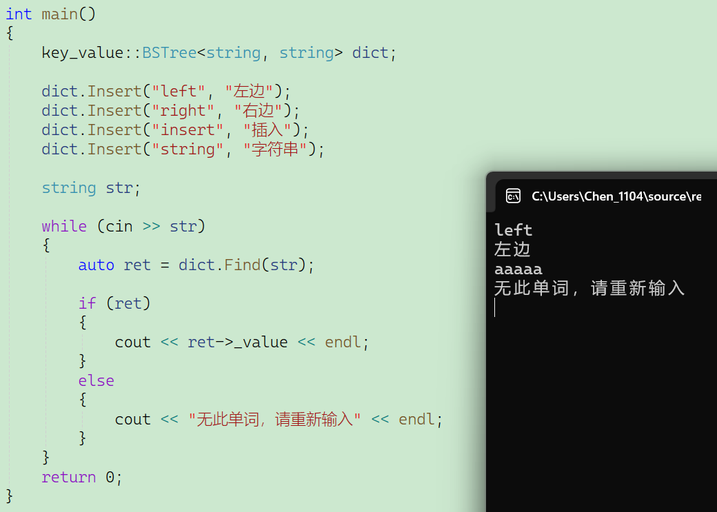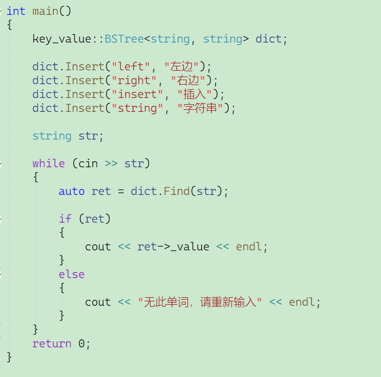 这里给出一个测试用例,实例化了一个对象dict代表字典,然后插入英文和中文,将要查找的单词输入到str当中,再去进行查找,如果找到,就打印出来这个单词对应的中文,否则打印:无此单词,请重新输入。