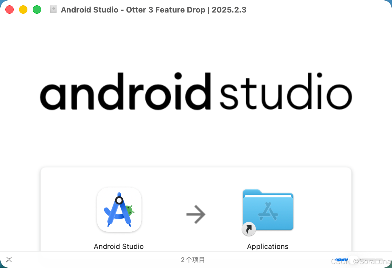 双击 AndroidStudio.dmg,将 Android Studio 图标拖拽至 Applications 目录。