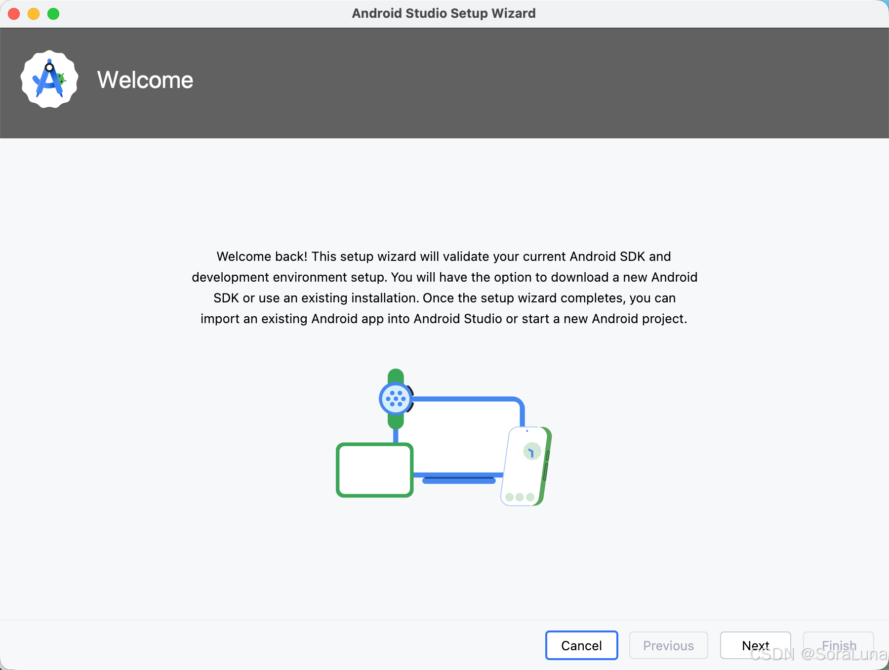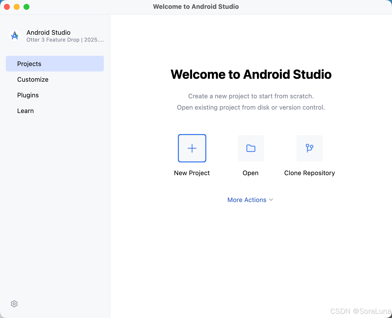 在 Applications 目录中启动 Android Studio,进入欢迎界面。