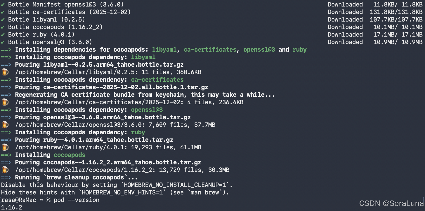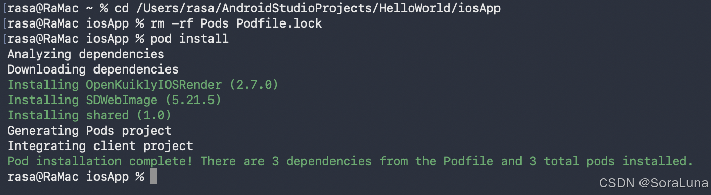 安装完成后生成 Pods 目录与 *.xcworkspace 文件。