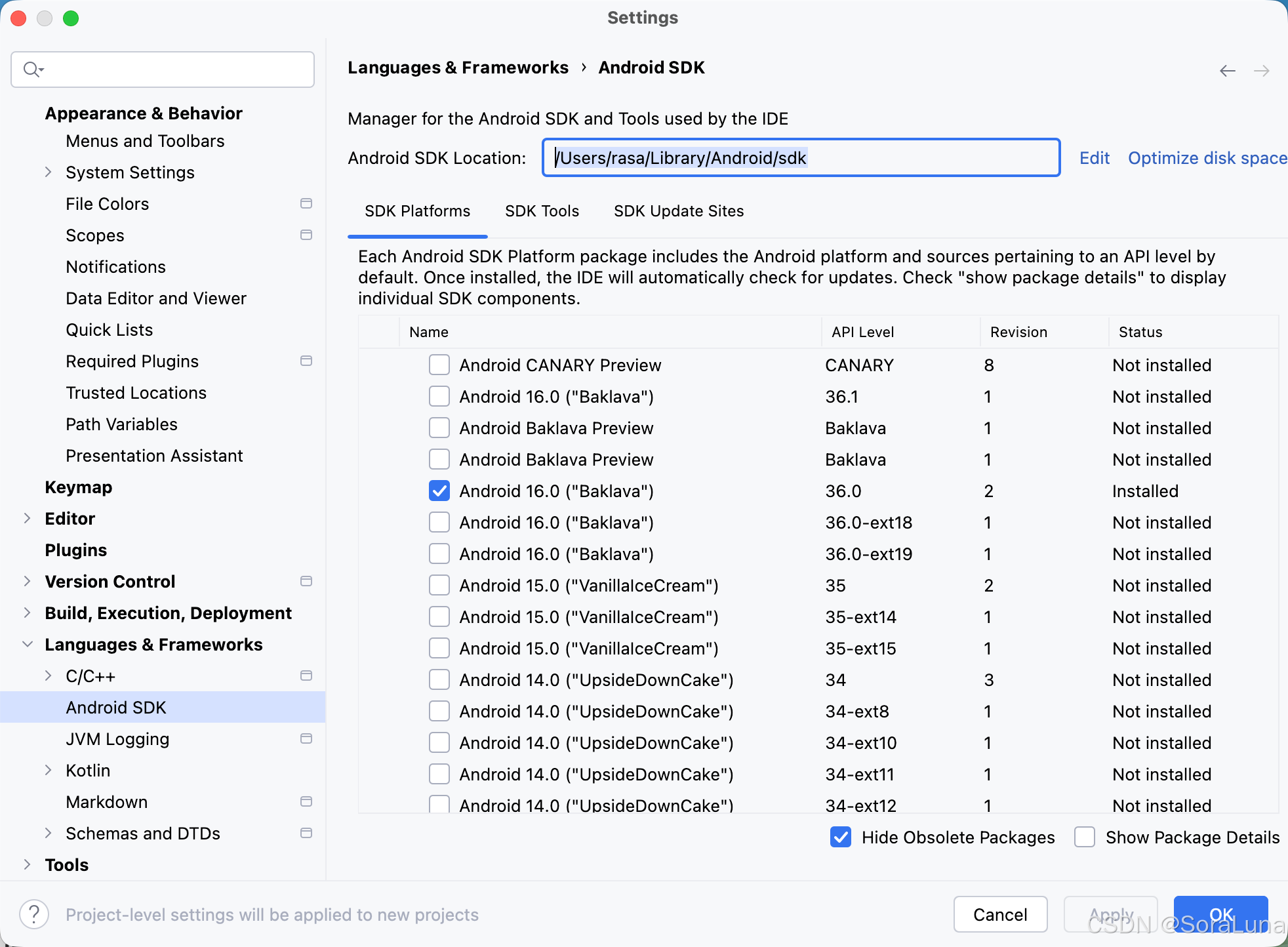 Android Studio → Settings → Languages & Frameworks → Android SDK