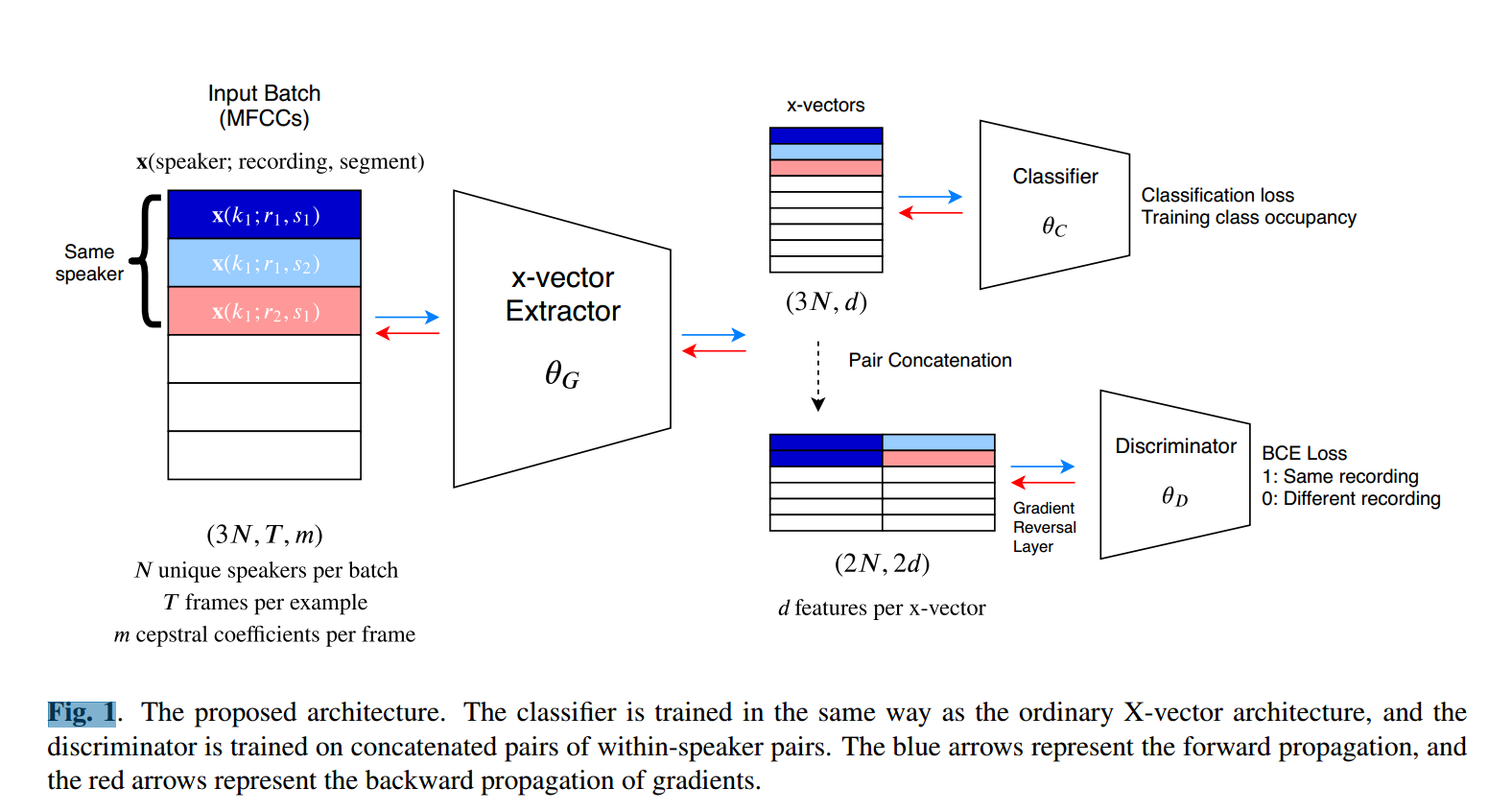 本文中,对抗器对嵌入对进行二分类 :判断其是否来自同一录音,从而惩罚嵌入中包含的通道信息。具体实现是在嵌入后接一个带梯度反转层的判别器,输入为拼接后的嵌入对,输出为二元预测。