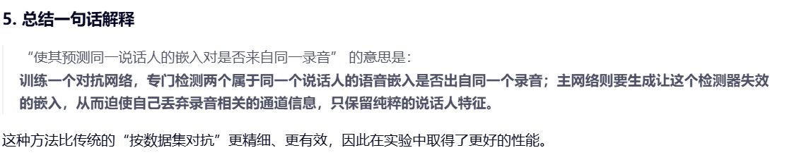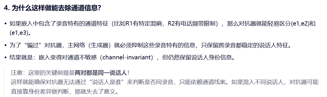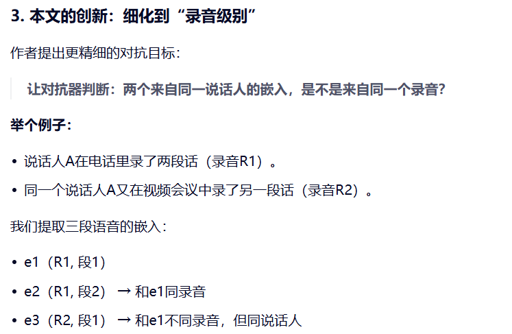 关键问题在于:应如何选择用于训练判别器的嵌入对?若随机选择嵌入对(50%来自同一录音),可能导致判别器通过说话人身份推断录音信息------这与主训练目标背道而驰。因此,必须确保判别器仅接收来自同一说话人的嵌入对。