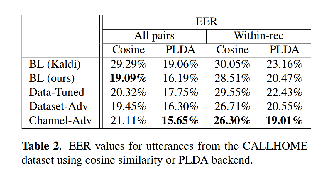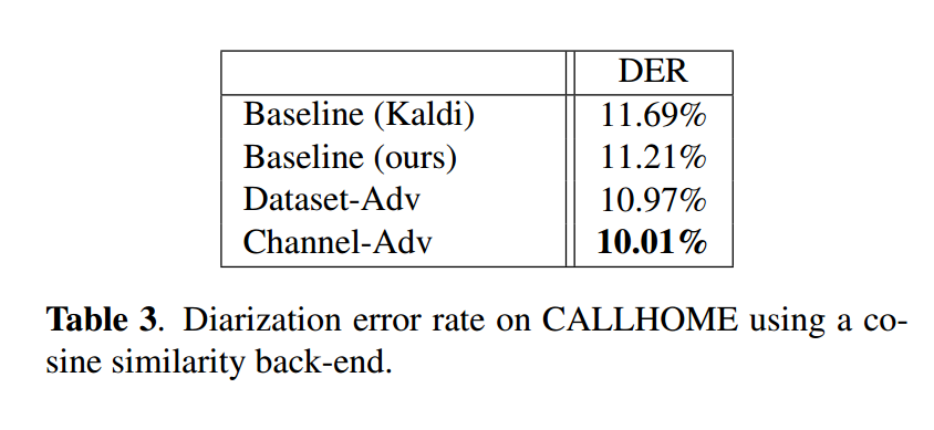 表3展示了CALLHOME上的日志性能(余弦相似度后端),通道对抗模型再次表现最佳。