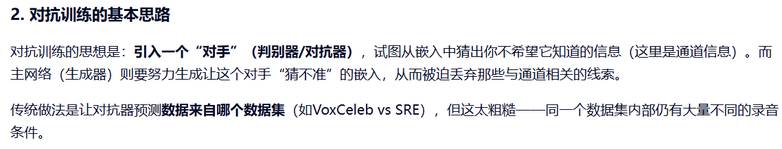 以往在说话人表征的对抗学习中,通常让对抗器对生成特征所属的数据集或标注环境进行分类,以鼓励域不变性[4,12]。然而,这种建模方式较为粗糙。例如,在数据集对抗训练[12]中,同一数据集内的变化未被惩罚,而是依赖不同数据集之间的差异来诱导有意义的不变性。