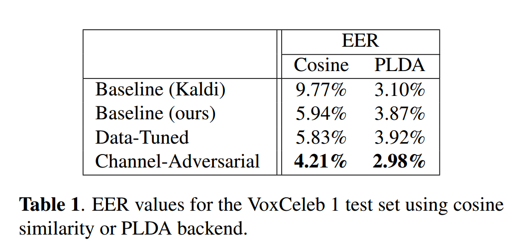 表1展示了VoxCeleb上的说话人验证结果 。若从零初始化训练整个通道对抗模型,模型无法收敛;但若在已收敛基线模型基础上加入判别器,则性能显著提升(表中标为"Channel-Adversarial") 。"Data-Tuned"模型为对照组(从相同起点继续训练但无对抗器),其性能从未超越基线。本文基线在余弦相似度上优于Kaldi基线,可能得益于注意力统计池化和角度惩罚Softmax。与Okabe等人[17](EER 3.8%)相比,本文结果更具竞争力。尽管近期VoxSRC⁴竞赛中EER<2%(使用更深模型和更高维输入),但本文在小幅修改原始x-vector架构下,仍优于许多更深或参数更多的模型[21,22]。