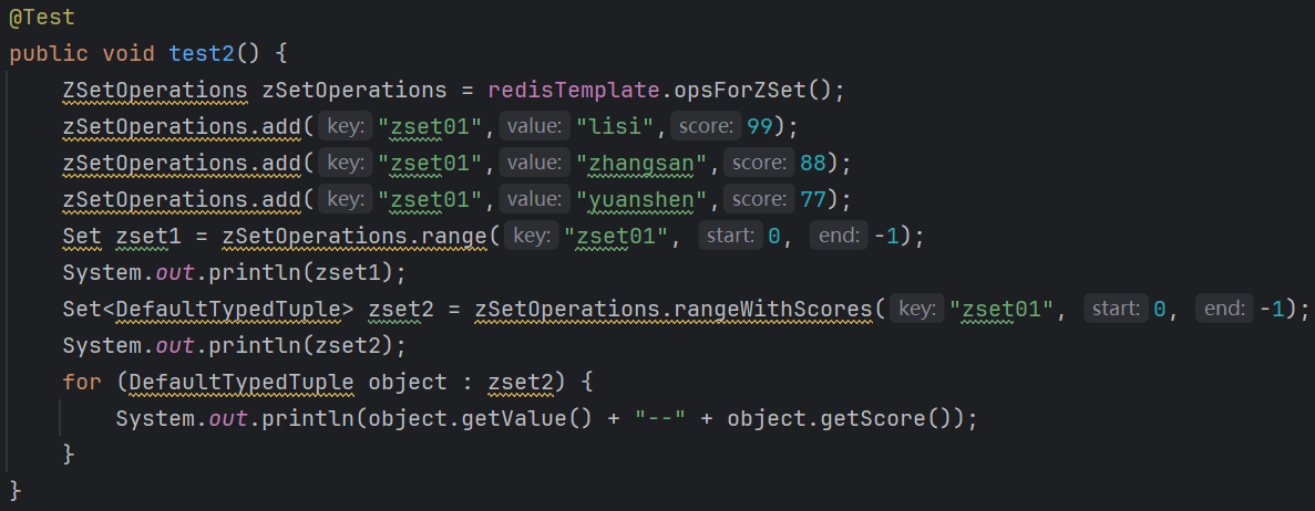 opsForZSet获取对应Operations,专门用于ZSet类型数据操作。常用新增操作add,三个参数,key名字,value值、value值对应的分数score。range方法三个参数,查询的ZSet的key名、起始索引、末尾索引。rangeWithScores方法同上,唯一区别就是返回的值里面第二维是带有value值和score分数的二元组。而且这个二元组DefaultTypedTuple有getValue和getScore两种方法,分别获取value和score。两种查询方法查出来的数据都是按照score升序排序的。