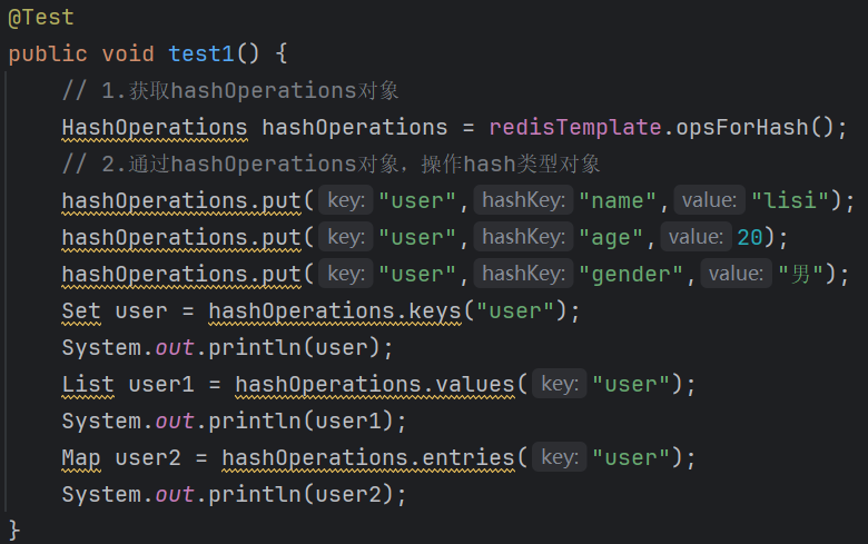 opsForHash获取对应Operations,专门用于Hash类型数据操作。常用新增操作put,三个参数,key名字,哈希桶的键名、哈希桶的值。keys方法获取所有哈希桶的键名、values方法获取所有哈希桶的值、entries方法获取所有哈希桶键值对。