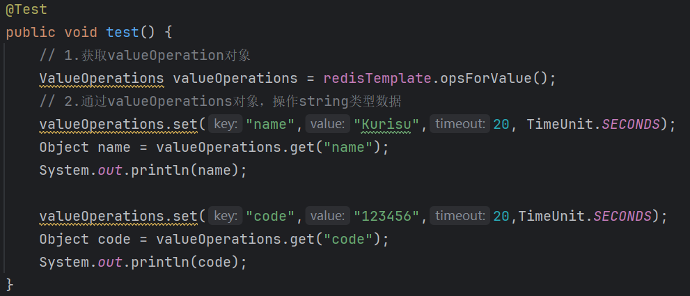 无论使用哪种Operations,第一步都是先使用redisTemplate对象获取对应Operations。ValueOperations是专门用于String数据操作,通过opsForValue获取到。常用set、get方法,set四个参数分别是key名字、key的值、超时时间、超时时间单位。