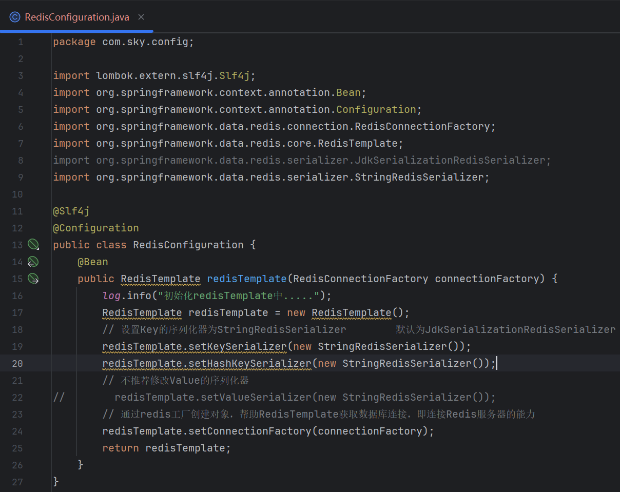 @Bean配合@Configuration将RedisTemplate放入IOC容器中,同时设置Key的序列化器为StringRedisSerializer,即把键key的序列化反序列化方式设定为StringRedisSerializer。