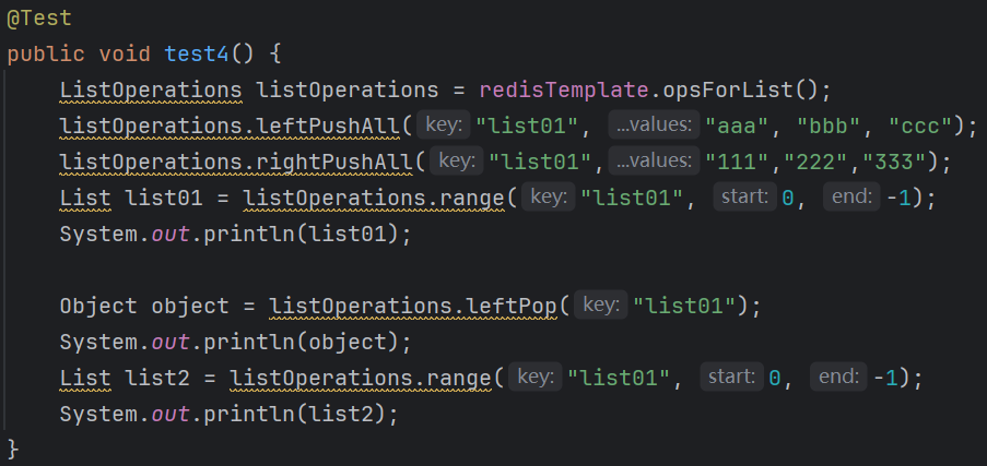 opsForList获取对应Operations,专门用于List类型的数据操作。常用新增操作leftPushAll或者rightPushAll,两个参数,key名字,value值。这个value可以一次性添加多个value。查询操作range,三个参数key名、起始索引、末尾索引。移除操作leftPop剔除头部第一个元素。