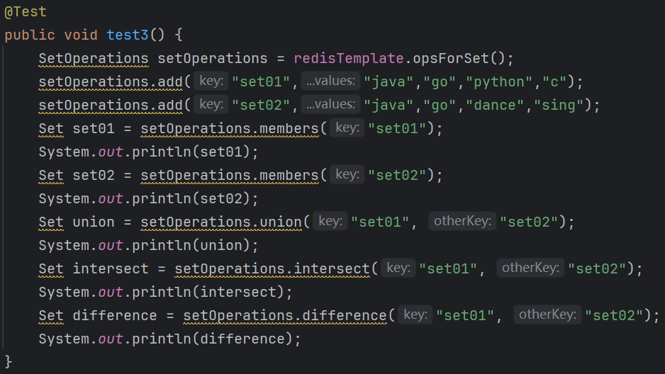 opsForSet获取对应Operations,专门用于Set类型数据操作。常用新增操作add,两个参数,key名字,value值。这个value可以一次性添加多个value。查询操作members,获取给定键名的集合Set。求并集union,求交集intersect,求差集difference(前面差后面)。