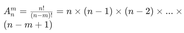 理解 :排列强调 "顺序"。比如从 1、2、3、4 四个数中选 3 个排成一列,123 和 321 是不同的排列,因为顺序不同。计算时,第一个位置有 n 种选择,第二个位置有 n-1 种(选了一个元素后剩下的),以此类推,直到选够 m 个位置,所以是 m 个连续整数的乘积。