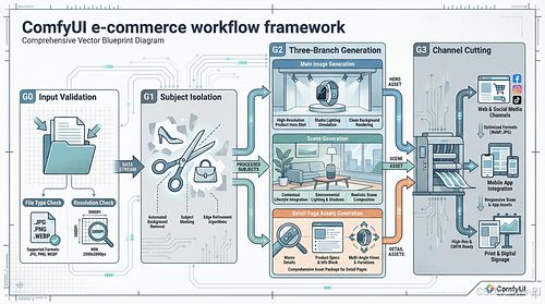 在电商场景里,ComfyUI 不是"做几张好看的图",而是一个可批处理、可复现、可交付 的"素材工厂"。这一篇我们把骨架搭出来:从白底图出发,一次跑通主图/场景图/详情页素材包,并把输入规范、输出规格、渠道裁切策略固化成"工程契约"。
