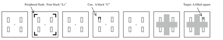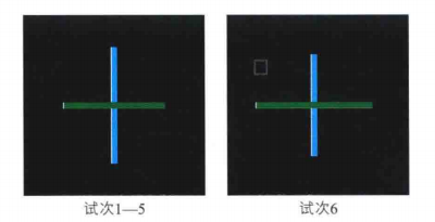 由于没有施加注意而引起的视盲被称为非注意视盲。Cartwright-Finch和Lavie(2007)设计了一个关于非注意视盲的实验。实验先后对被试呈现6次"十字",被试的任务是比较十字两条线段的长度。十字是快速闪现,并且两条线仅略有不同,因此被试需要在这个任务中花费较多的注意。与前面5次呈现不同,第6次呈现的十字旁边会出现一个小正方形,如图4。任务结束后,主试立即问被试是否有见过什么特别的东西,但在20个被试中,只有2个被试注意到那个小正方形。这说明即使是眼前的事物,如果不施加注意,这些事物也有可能不会被知觉到。