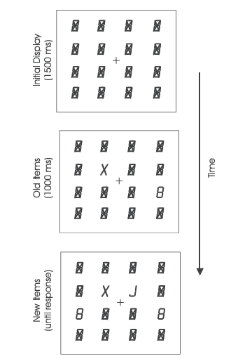 Pratt等人(Pratt,Theeuwes和Donk,2007)的预览效应实验范式可以归纳为3步:第一步呈现初始图片,该图片由若干个由"8"和"X"构成的复合符号组成;第二步形成旧客体,即对一些复合符号的"8"进行移除使之变为新客体"X",同时对一些复合符号的"X"进行移除使之变为新客体"8";第三步,重复第二步形成新客体,并且将一个复合符号置换为目标"L"或目标"J"。当呈现L时被试需要按"z";当呈现J时被试需要按"/"。实验流程如图10所示。结果发现,呈现的新客体不管是亮度增加还是减小,对目标的搜索都仅受新客体数量的影响(不受旧客体影响),表现出预览效应;相反,当新客体呈现时不伴随亮度变化,对目标的搜索同时受新客体和旧客体数量的影响,没有表现出预览效应。这表明,呈现的新客体不管是伴随亮度的增加还是减小,都表现出预览效应。