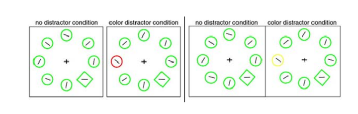 另外,当这种分心物在物理特征上不具备凸显性时,这种效应就会消失。如将红色圆圈改为黄色(图7(b)),这时它在其他绿色刺激中并不突出。结果表明,被试在分心物条件下的搜索时间与控制条件下的并无差异,说明黄色圆形并无捕获注意。