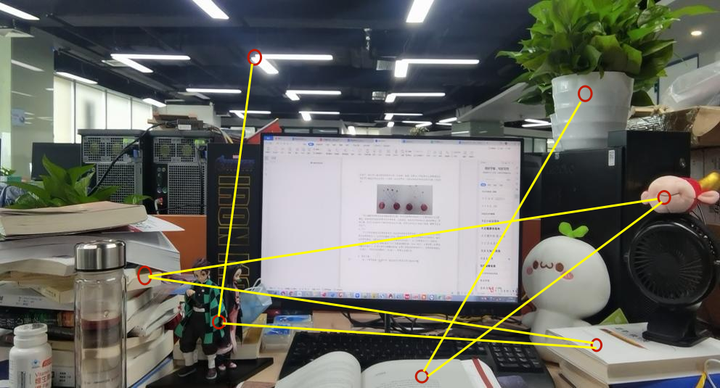 虽然视觉注意是有限的,但通过眼动扫描场景的方式(即将目光转移到场景的不同位置上),可以不断收集场景上的信息。眼睛注视的地方叫注视点,这时注视目标处于中央凹中(Goldstein和Brockmole,2017(张明等译))。从一个注视点到另外一个注视点叫扫视眼跳。如在图中,红色圆圈表示注视点,黄色连线表示眼跳。从绿植开始直到L型灯,整个连线表示眼动的轨迹。