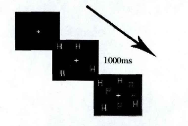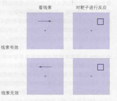 研究发现,注意能够增强或加速我们对客体的反应。对特定位置的注意被称为空间注意。Posner等人(1978)使用预线索化范式证明了注意特定的位置会增强个体对这个位置呈现刺激的反应,见图1。在实验中,要求被试始终注视中央的"+"号位置。首先被试将会看见一个箭头,提示目标刺激可能的一侧。在这个过程中被试无须进行眼动,所以此时是内隐注意。被试的任务是,当目标方块出现后尽快地进行按键反应表示目标出现位置。目标的出现位置可能与箭头所指方向一致(80%的试次),这种条件下称为有效试次;也可能不一致(20%的试次),称为无效试次。实验结果表明,被试对有效试次的反应明显快于无效试次。