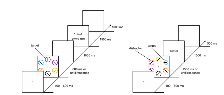 近年来,研究者发现了一种新的注意捕获方式------价值驱动注意捕获(Anderson,Lauren和Yantis,2011)。同时,他们设计了价值驱动注意捕获实验范式,实验过程如图8所示。该范式分为两个阶段,价值训练阶段和测试阶段。在价值训练阶段(图(a)),首先给被试呈现6个带有不同颜色的包含线段的圆形,被试的目标是即快又准地找到红色或绿色的圆形,然后报告其内部线段的朝向。在每个试次中,红色或绿色只呈现一种。在每个试次结束后,会给被试反馈一些金钱奖励。在一半被试中,当呈现的目标颜色是红色时,80%得到高奖励,20%得到低奖励,当呈现的目标颜色是绿色时,高低奖励安排恰恰相反。在另外一半被试中,当呈现的目标颜色是绿色时,80%得到高奖励,20%得到低奖励,当呈现的目标颜色是红色时,高低奖励安排恰恰相反。测试阶段与价值训练阶段非常类似,但有几点不同(图(b))。首先,测试图片呈现5个圆形和1个菱形(颜色各不相同),菱形是搜索目标。其次,该阶段分为分心物条件和控制条件。分心物条件下,其中一个分心物会呈现红色或绿色的一种;而在控制条件下,红色与绿色都不会出现。最后,在测试阶段没有奖励反馈。实验发现,在测试阶段中,相较于控制条件,在分心物条件下被试的视觉搜索会变慢,且高奖励刺激比低奖励刺激更能捕获注意。在这个实验中,红色和绿色干扰物既与当前的搜索任务无关,也不具备物理上的突显性(图片中所有刺激物的物理突显性都是同等程度的),但被试还是会被捕获注意。研究者认为,这是因为这两种颜色的分心物分别与奖励价值建立联结,而这些价值驱动被试注意它们。