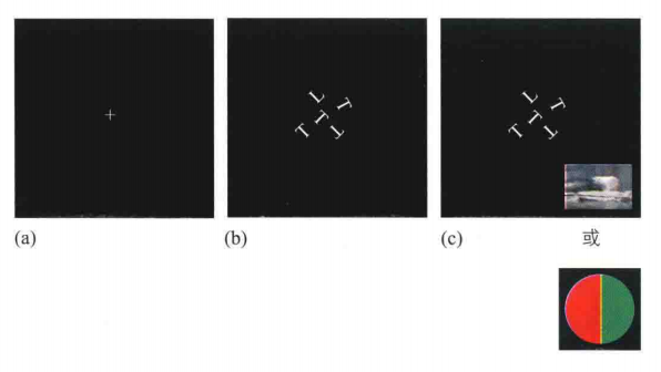 有证据显示,注意对于知觉客体是非必要的。李飞飞等人(Fei-Fei,Van Rullen,Koch 和Perona,2002)设计了一个双任务范式,被试在实验中要同时完成一个需要注意参与的中央任务和一个判断场景内容的外周任务。被试在实验开始时需要注视着屏幕上的"+"号(图5(a)),然后屏幕中央会出现一个由5个字母组成的刺激物。有些试次中5个字母完全相同,在有些试次中会有一个字母与其他四个不同(图(b))。字母呈现后会立即在屏幕周边的随机位置出现一个呈现时间为27毫秒的次要刺激(一半红一半绿的圆盘或是一张风景图)(图(c))。被试的中央任务是判断中央呈现的五个字母是否相同,外周任务是判断在外周呈现的图片中是否有动物或者圆盘上的颜色是"红-绿"还是"绿-红"。即使被试为了完成中央字母任务必须将注意集中在屏幕中央的字母上,但当外周任务是判断风景图时,其正确率是90%;不过当外周任务是判断圆盘颜色时,其正确率只有50%。因此研究者推断知觉极少或不需要注意的参与。