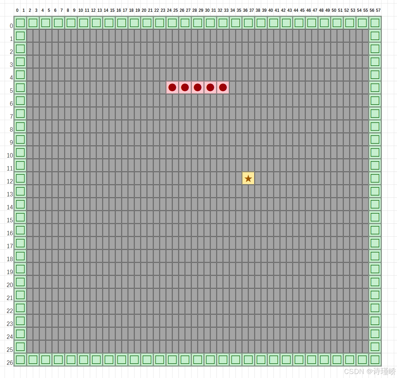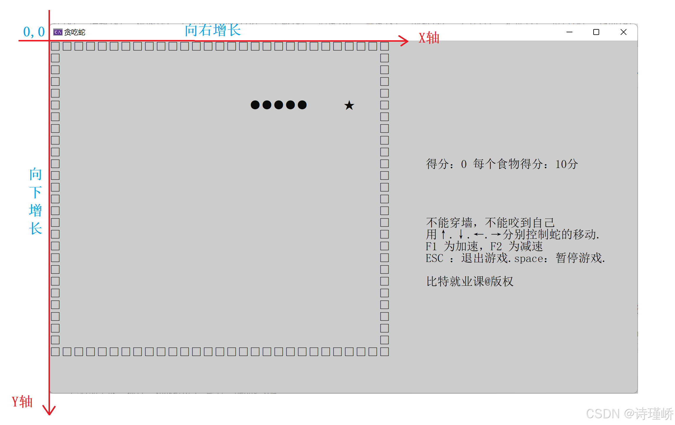 贪吃蛇游戏的地图,可通过方向键控制贪吃蛇的方向,蛇撞墙游戏结束,蛇撞自身游戏结束,实时计算得分,控制蛇加速或减速,暂停游戏,随机刷新不同食物以及穿墙果实提供穿墙功能。