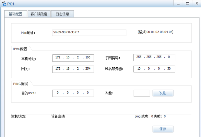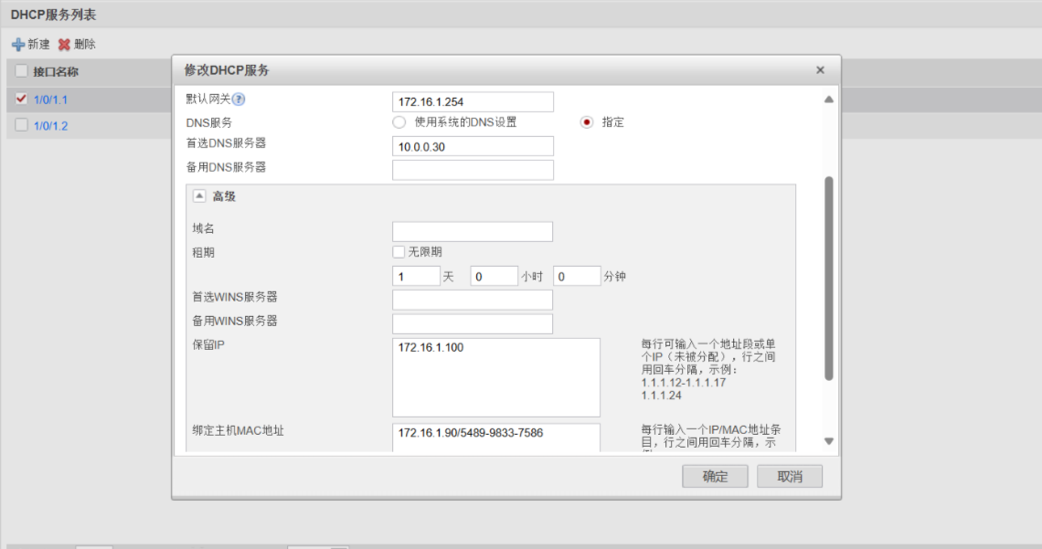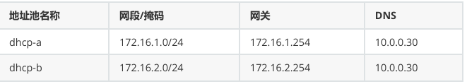 - 创建两个全局地址池,dhcp-a 对应 172.16.1.0/24 网段,网关为 172.16.1.254,DNS 为 10.0.0.30,供 Client1 和 Client3 使用,其中为 Client1 绑定固定 IP 172.16.1.90;dhcp-b 对应 172.16.2.0/24 网段,网关为 172.16.2.254,DNS 为 10.0.0.30,供 PC2 使用。