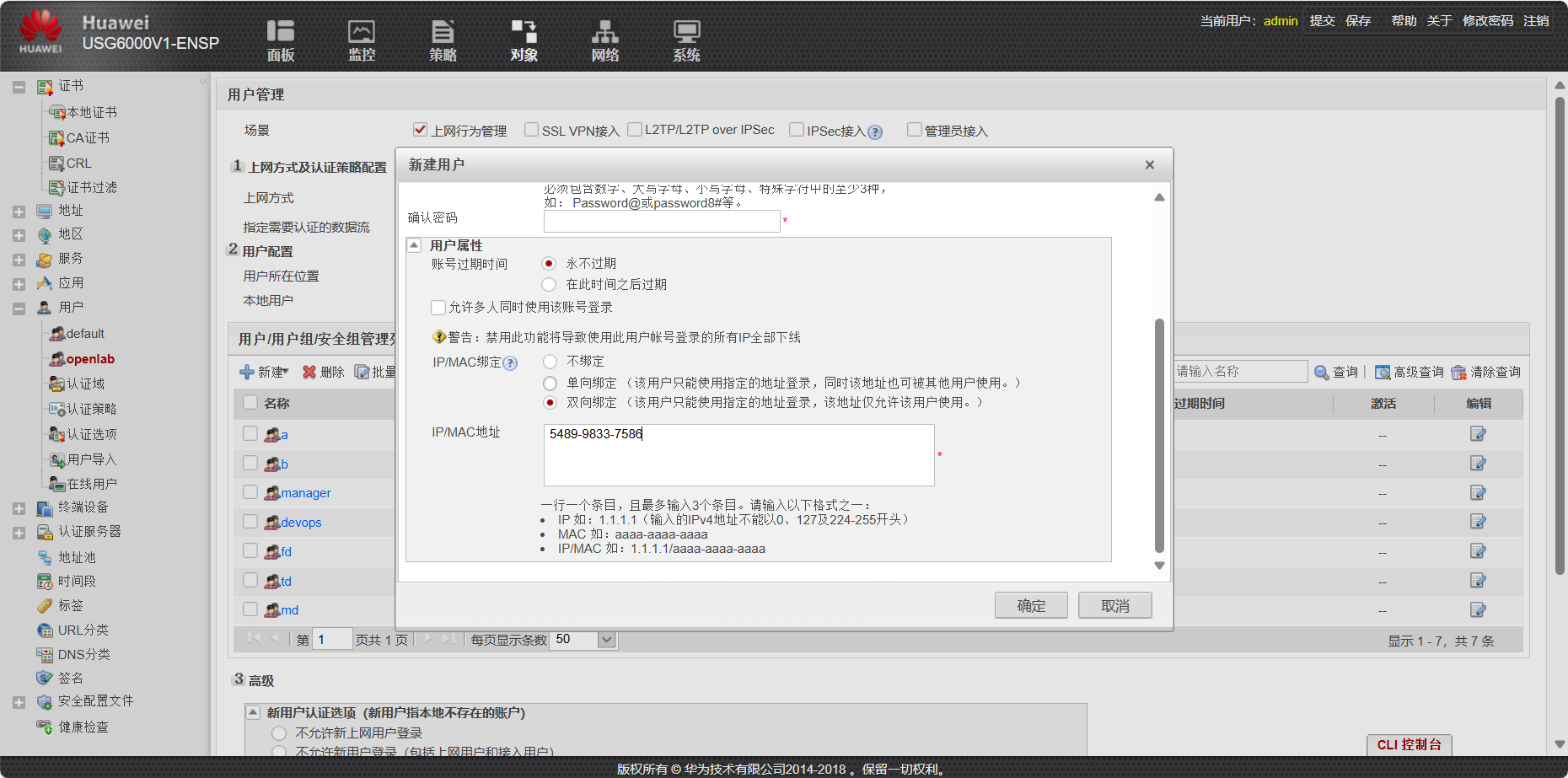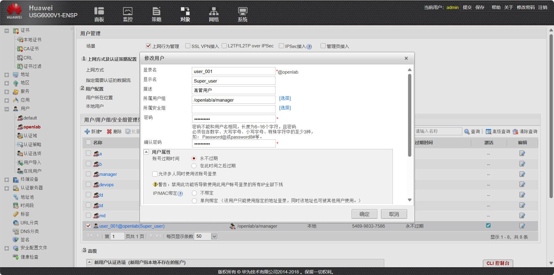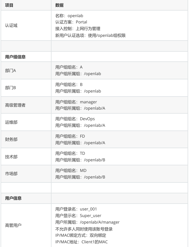 - 配置各部门用户账号,统一初始密码为admin@123,首次登录需强制修改密码。高管用户user_001(所属/openlab/A/manager)需绑定 Client1 的 IP 与 MAC 地址,不允许多人同时登录;运维用户DevOps_001(所属/openlab/A/DevOps)不允许多人同时登录;财务用户FD_001(所属/openlab/A/FD)需绑定 IP 172.16.1.100 与对应 MAC 地址,不允许多人同时登录;技术用户TD_001~TD_003(所属/openlab/B/TD)允许多人同时登录;市场用户MD_001~MD_005(所属/openlab/B/MD)不允许多人同时登录,账号有效期设为 10 天。