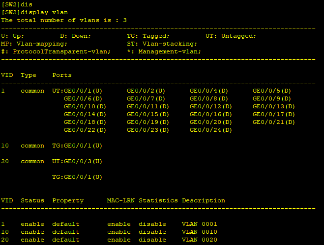 [SW2-GigabitEthernet0/0/1]port trunk allow-pass vlan 10 20