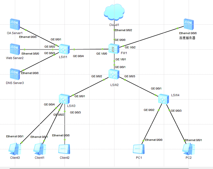 - 服务器:OA Server 的 Ethernet0/0/0 接口配置 IP 10.0.0.10/24,Web Server 配置 IP 10.0.0.20/24,DNS Server 配置 IP 10.0.0.30/24,百度服务器配置 IP 100.1.1.1/24。