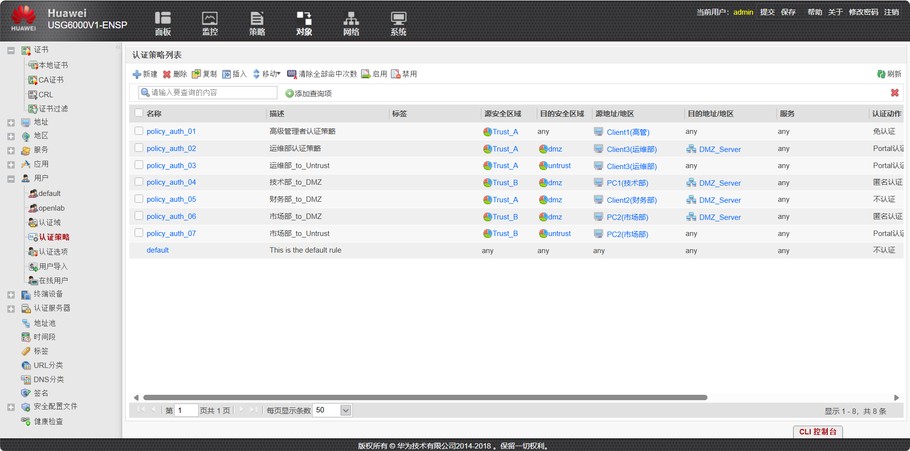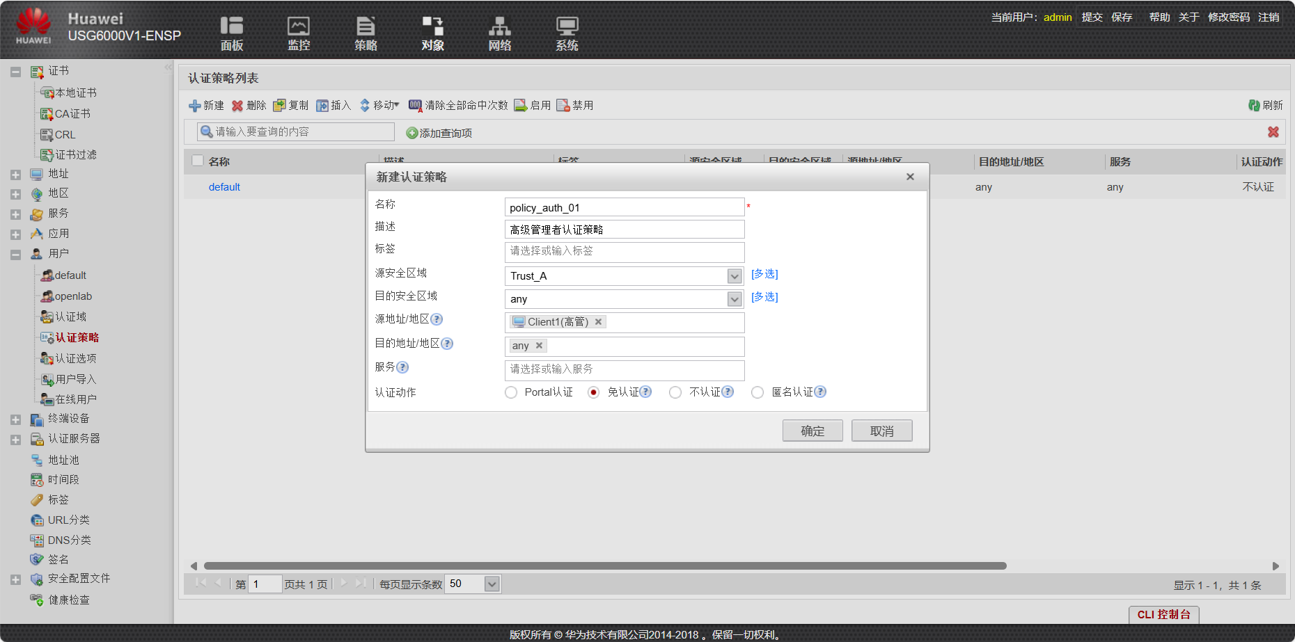 - 财务部(Client2)从 Trust_A 区域访问 DMZ 区域,执行不认证动作;禁止财务部访问外网。