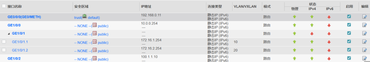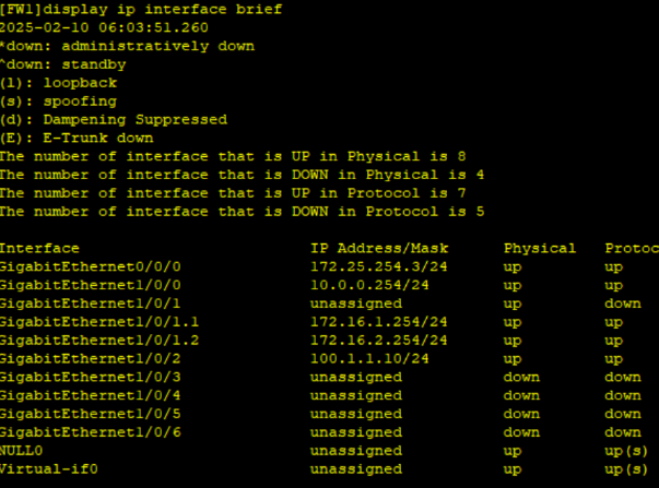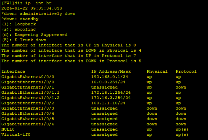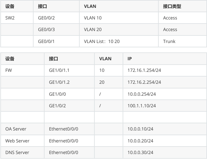 - 防火墙(FW):子接口 GE1/0/1.1 绑定 VLAN 10,配置 IP 172.16.1.254/24;子接口 GE1/0/1.2 绑定 VLAN 20,配置 IP 172.16.2.254/24;物理接口 GE1/0/0 配置 IP 10.0.0.254/24,物理接口 GE1/0/2 配置 IP 100.1.1.10/24。