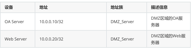 - 创建 DMZ_Server 地址组,包含 OA Server(10.0.0.10/32)、Web Server(10.0.0.20/32)和 DNS Server(10.0.0.30/32),描述为 "DMZ 区域服务器集合"。