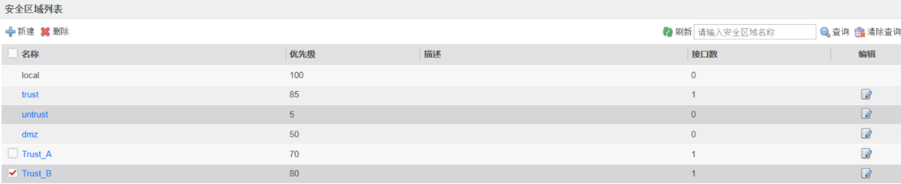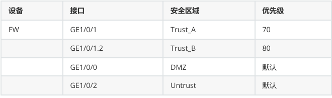 - 将防火墙接口 GE1/0/1 划分至 Trust_A 区域,优先级设为 70;接口 GE1/0/1.2 划分至 Trust_B 区域,优先级设为 80。