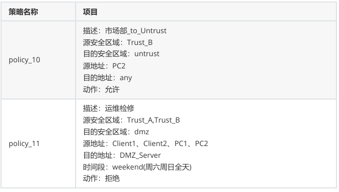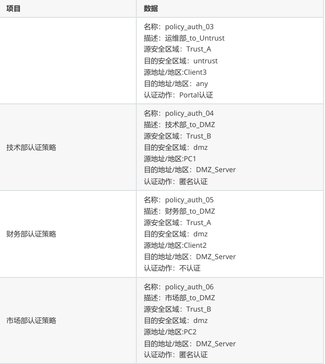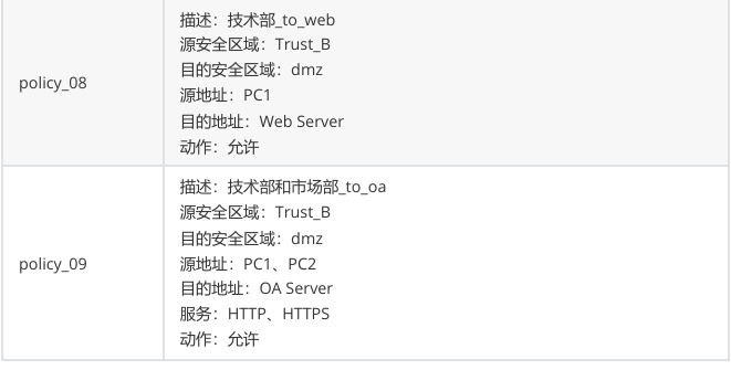 - 技术部(PC1)从 Trust_B 区域访问 DMZ 区域,执行匿名认证动作;禁止技术部访问外网。