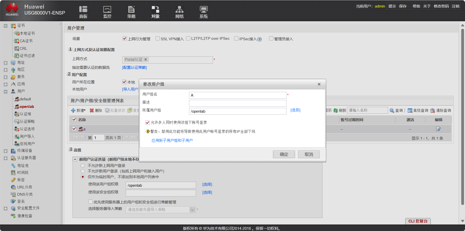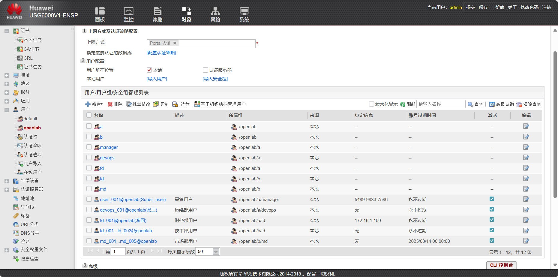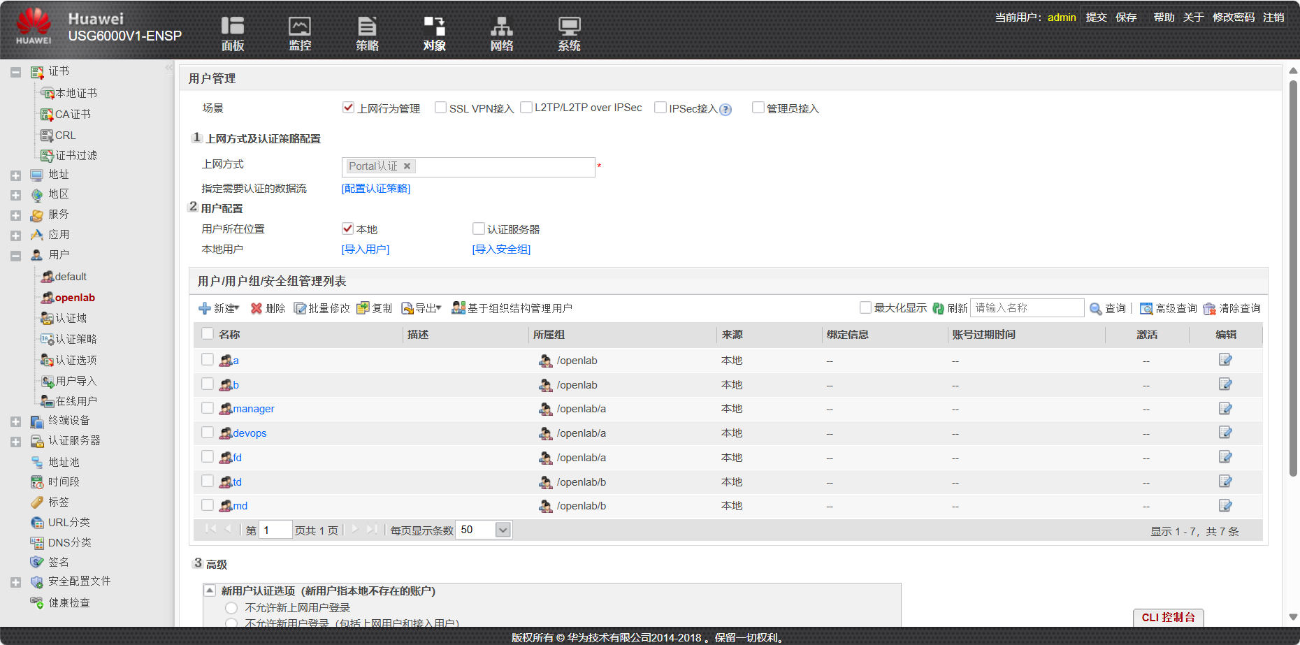 - 创建名为openlab的认证域,采用 Portal 认证方案,接入控制设为上网行为管理,新用户默认使用/openlab组权限。