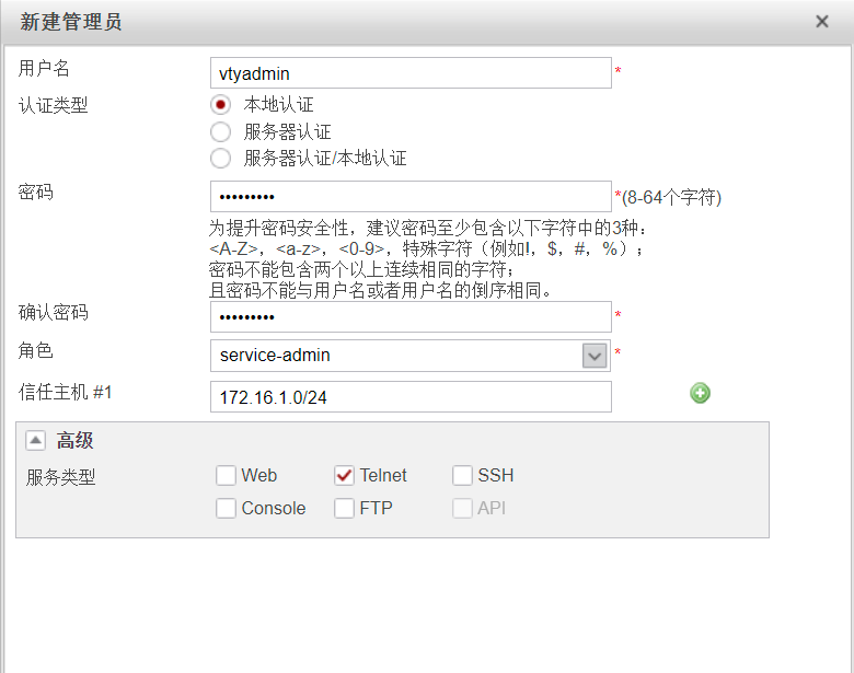 - 创建管理员账号vtyadmin,密码设为admin@123,管理员 PC 固定 IP 为 172.16.1.10/24。
