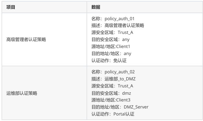 - 运维(Client3)从 Trust_A 区域访问 DMZ 区域和 Untrust 区域,均执行 Portal 认证动作。