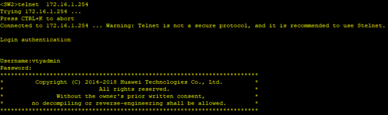 <SW2>telnet 172.16.1.254
