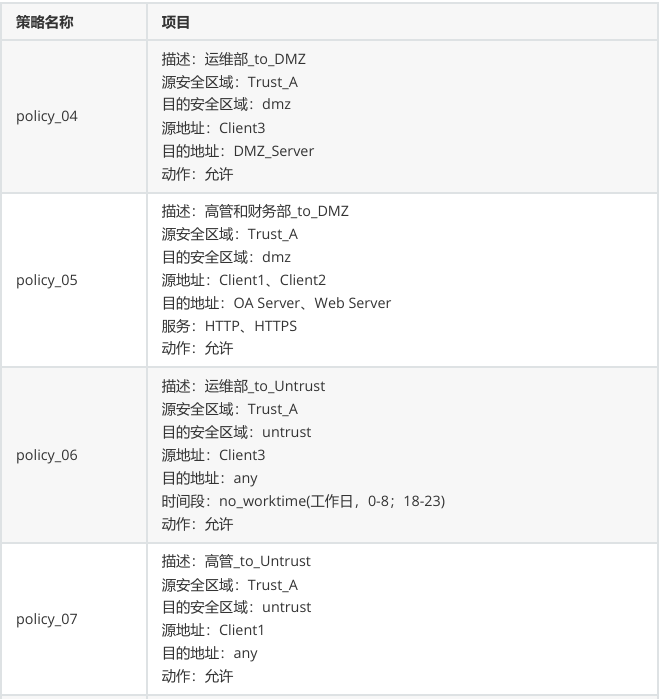 4、部门A中分为三个部门,运维部、高管、财务。 a.运维部允许随时随地访问DMZ区域,并对设备进行管理; b.高管和财务部仅允许访问DMZ区域的OA和Web服务器,并且只有HTTP和HTTPS权限。 c.运维部允许在非工作时间访问互联网环境 d.高管允许随时访问互联网环境 e.财务部任何时间都不允许访问互联网环境