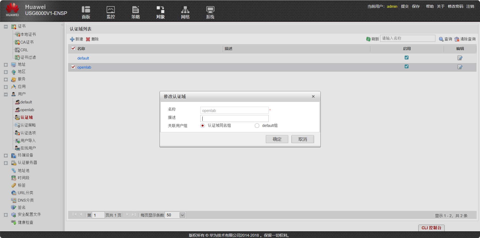 3、新建一个认证域,所有用户属于认证域下组织架构