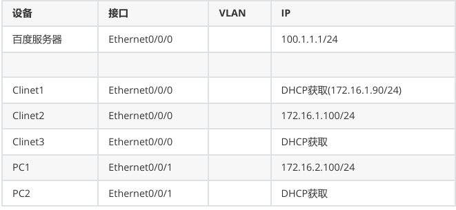 - 终端设备:Client1 通过 DHCP 获取固定 IP 172.16.1.90/24,Client2 配置静态 IP 172.16.1.100/24,Client3 通过 DHCP 获取 172.16.1.0/24 网段 IP(需排除 172.16.1.90 和 172.16.1.100);PC1 配置静态 IP 172.16.2.100/24,PC2 通过 DHCP 获取 172.16.2.0/24 网段 IP(需排除 172.16.2.100)。