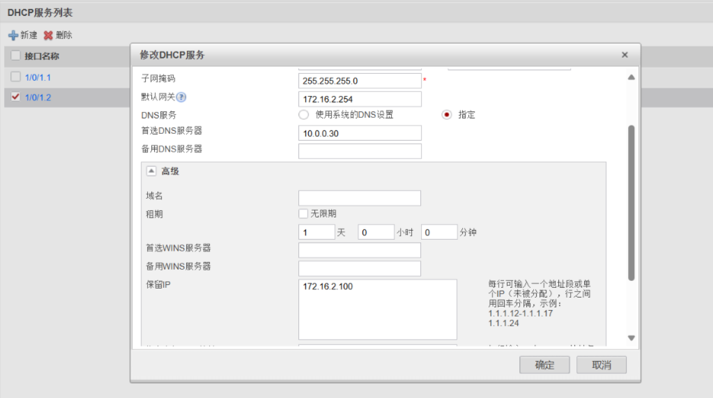[FW1-GigabitEthernet1/0/1.2]dhcp select interface